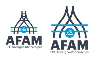 Cette piste a été travaillée sur le nom AFAM pour en faire le logo/picto. Les lettres deviennent un paysage vue du dessus. Elles se rejoignent en courbes pour suggérer les virages des routes sinueuses de montagne (spécifiques à la Région) mais aussi des villes. Les barres horizontales des « A » et du « F » se transforment en itinéraire plus direct qu’offre le train. La voie semble passer en dessous puis au dessus des lettres, suggérant les tunnels et ponts passant au travers les reliefs. Les coupures blanches de la ligne permettent d’améliorer la lecture du nom mais aussi celle du symbole.